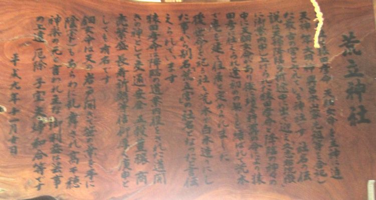 瓊々杵尊(ににぎのみこと)が天照大神の命を受けてこの国に降臨される途中で天孫一行を道案内をされた猿田彦命(さるたひこのみこと)と天鈿女命(あめのうずめのみこと)が結婚して住まわれた地と伝えられ、切り出したばかりの荒木を利用して急いで宮居を造ったため、荒立宮と名付けられたといわれています。