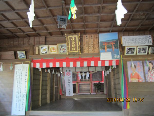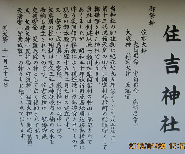 又、安芸(広島県)の宮島、厳島神社の海中に建つ大鳥居の柱の用材は文久三年当神社境内の楠の大木を奉納し建立されたものです。住吉大神は、航海守護、交通安全、災難厄除の神として広く信仰されており、又、大歳大神(農作物の守護神)稲荷大神(商売繁盛)、天満宮(学業成就)の神々もお祀りされております。