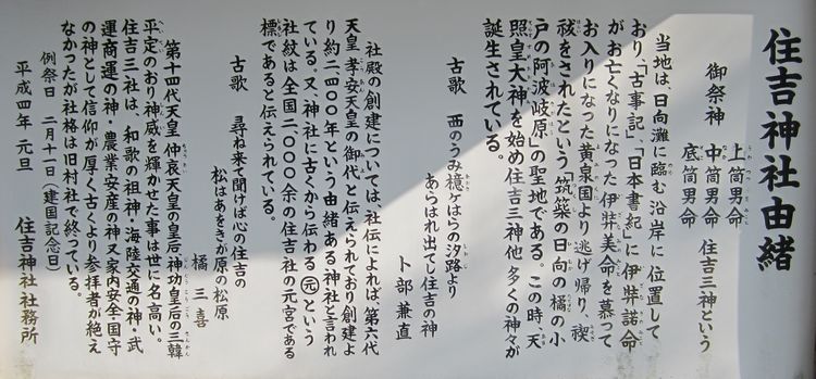 神武天皇は、都を置いたとされる宮崎神宮の摂社・皇宮屋(こぐや、皇宮神社)を発して日向・美々津(宮崎県日向市)から東征の舟出をするにあたり、航海の安全を美々津の立磐(たていわ、現 立磐神社)で祈願した。その際、神武天皇の6代祖先で航海の神様である住吉神社の住吉三神(底筒男命、中筒男命、表筒男命)を奉斎したとされており、孝安天皇以前の神武天皇の時にはすでに住吉神社があったとも言われる。