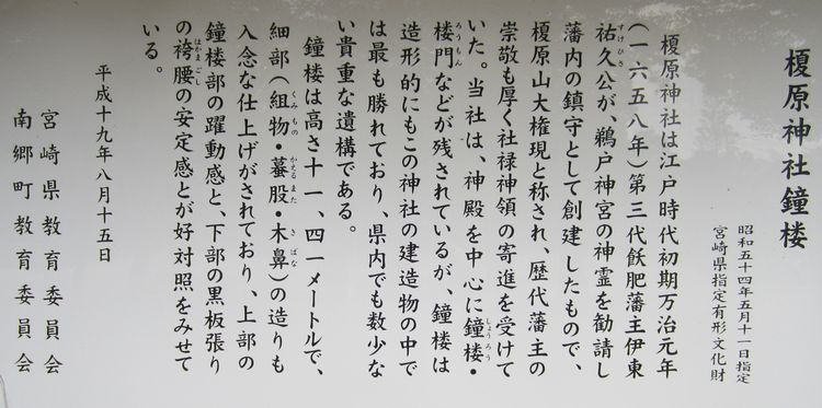 旧称は榎原大権現といい、飫肥3代藩主伊東祐久が鵜戸神宮のご分霊を勧請、地福寺境内を社地として創建した。鵜戸神宮とともに飫肥の御両社として、篤く崇敬された。社領ははじめ100石であったが、文化5年(1808)、11代藩主伊東祐民が150石に加増した。鵜戸参りと並んで榎原参りが近郷の信を集めていた。明治元年、榎原神社と改称、同6年郷社に列せられ、昭和5年8月1日県社に昇格された。これまでの当社創建についての研究によると、万治元年(1658)の勧請説で固まっているが、『県史蹟調査第6輯』では、当社縁起によると「明暦2丙申年(1656)11月27日大和守祐久公供伊東勘解由参詣於榎原別当真誉(鵜戸山別当)同参也」とあり、創建年月日は不詳にしても再興説が有力としており、『日向地誌』も再興説をとっている。
