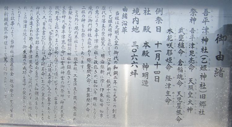 主祭神の「吾平津昆売命」は宮崎神宮の御祭神「神武天皇」が狭野尊と称され、まだ日向に在られた頃の妃であり「古事記」によればお二人の間には「多芸志美々命」「岐須美々命」二人の皇子ありとあり、また「日本書紀」には「手研耳命」お一人の皇子ありとある。