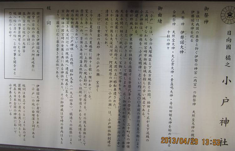 当社は景行天皇の勅によって創建したものという。紀元七百四十年代であろう。古来より、今の大塚地区と下北方地区より下流域、すなわち旧市街地全域を小戸と称し、大淀川河口小戸町小戸の瀬は小戸神社鎮座の清浄の地として祀られ、今も夏祭の名越歌に 「港口には黄金の真砂 沖の小戸の瀬 宝浮く」と歌いつがれ、三千年来、尊び敬われて来た。いわゆる、祓詞の筑紫の日向の橘の小戸という地目をそのままに、太古伊弉諾尊が禊祓をされたゆかりの地であり、皇祖天照大神をはじめ諸神ご誕生の聖地の神社であると伝える。