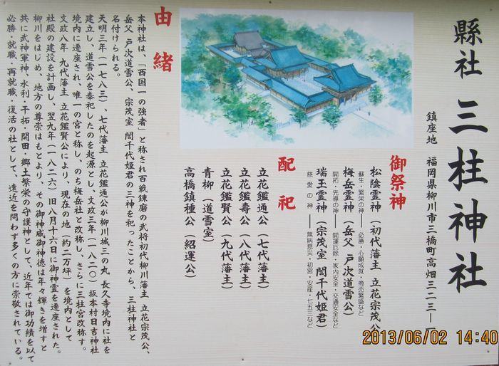 三柱神社は、「西国一の強者」と称された百戦錬磨の武将 初代柳川藩主 立花宗茂公、岳父 戸次道雪公、宗茂室 誾千代姫の三神を祀ったことから、三柱神社と称します。