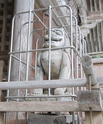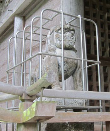 木堀りの狛犬さんです。以前盗難にあったことから檻に入れているとのことです。