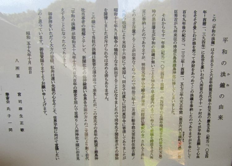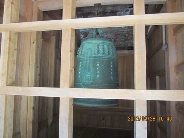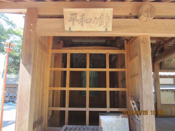 2013年9月28日、2回目の参拝で御朱印を頂くことができました。前回参拝した時に、平和の鐘は厳島神社に帰してしまうとのことでしたが、まだ存在していました。でも、11月6日に返却することになっているそうです。