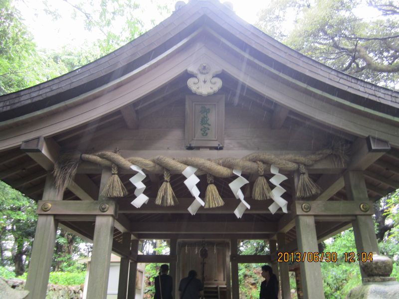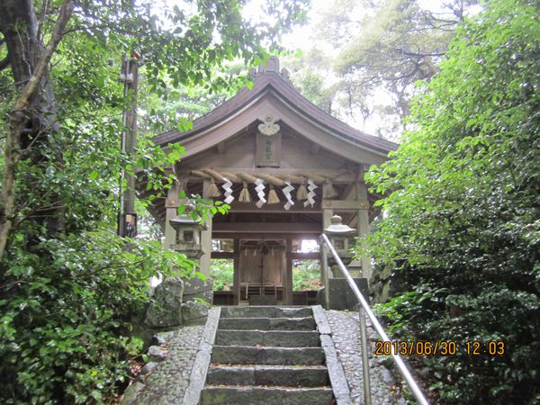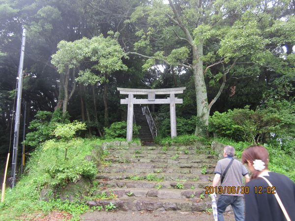 宗像市大島に鎮座する宗像大社中津宮への参拝のおり、マイクロバスで観光名所を巡る無料バスツアーがあったので参加したところ、中津宮の奥宮でもある御嶽神社に立ち寄り参拝しました。大島で一番高い御嶽山の山頂(標高224m)に鎮座しています。あいにくの天気で景色は良くありませんでしたが、短時間で大島の自然を堪能することができました。
