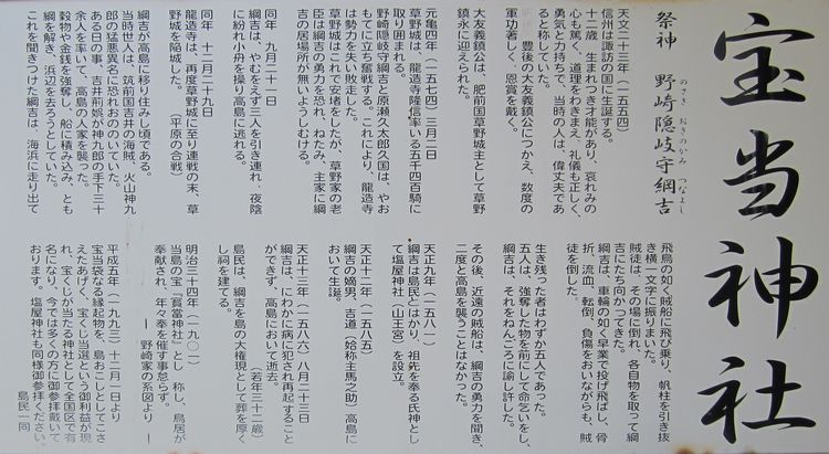 島の産業である製塩業が盛んになり島が潤い利益をあげた時、お礼として綱吉を祀った当神社を当島の宝と称え『寶當神社』と記した石造りの鳥居を奉納した。この頃より宝当神社(ほうとうじんじゃ)と呼ばれ親しまれてきました。
