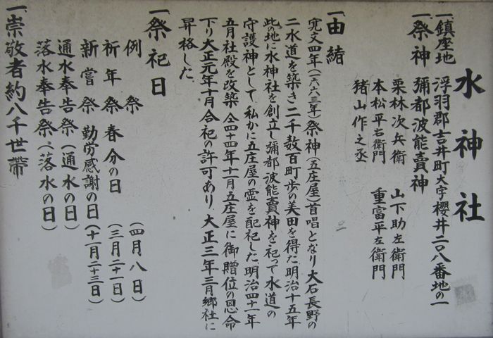 この偉業をたたえて五人の庄屋を祀ったのが長野水神社(五霊社)で、 4月8日の春の大祭には、小学生による「浦安の舞」が奉納され、 露店も出店し、 五庄屋の恩恵を受けている多くの人々が参拝に訪れます。長野水神社は桜の名所で、桜の時期は花見客でにぎわいます。