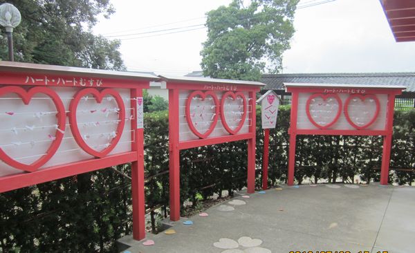 鳥居の扁額、敷石、おみくじ結びから垂れ幕までハートだらけでした。