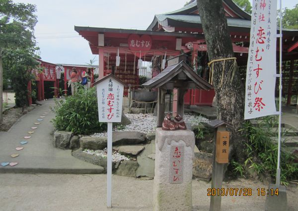 佐賀方面神社巡り、10社めは水田天満宮・恋木神社です。神崎の仁比山神社から、久留米の水田天満宮まで車での移動です。水田天満宮は菅原道真公を祀った神社で、参道、鳥居、社殿もそれなりに立派でした。ところが、本殿の裏にある境内社の恋木神社、これが何とも現代風というか、全く雰囲気が異なり、神社としてこれでいいのだろうかと思うような神社でした。参道の敷石、鳥居の扁額はハート型、拝殿、鳥居はピンク色、おみくじを結ぶリングは真っ赤なハート型。社名の“恋木”神社からこのようなことになっているのでしょうが、御朱印を頂くときに、巫女さんに水田神社と恋木神社はどういう関係なのですか、と聞いたところ、「水田神社は道真公をお祀りし、恋木神社は、道真公のお気持ちを表したものです。」との返事でした。道真公のお気持ちとは、都の天皇・妻子を思う気持ちのことのようですが、若いカップルや、女性グループがお参りしているところをみると、商売的にはうまくやっているようで、はたして菅原道真公はどう思っていることやら。