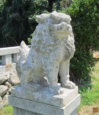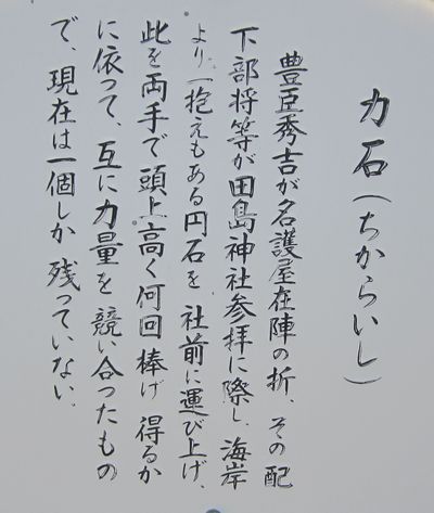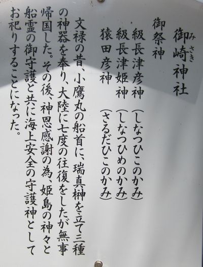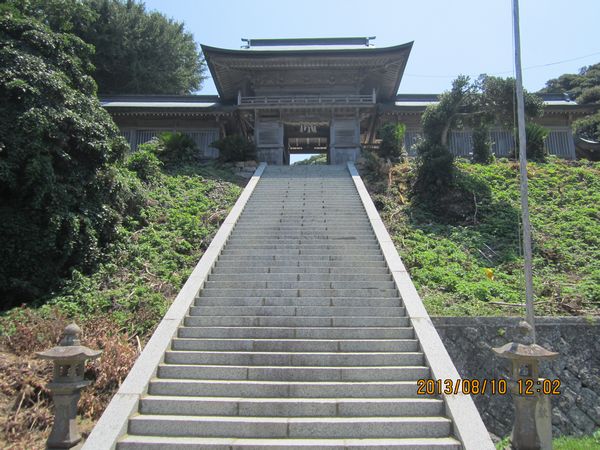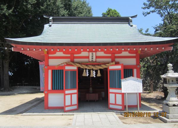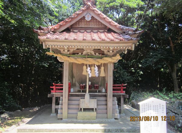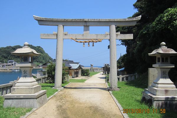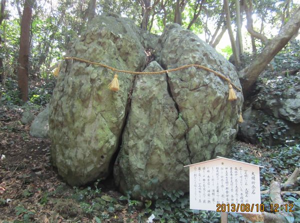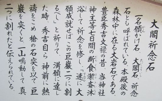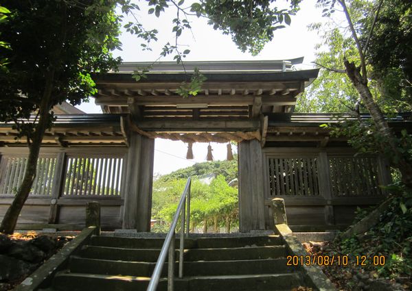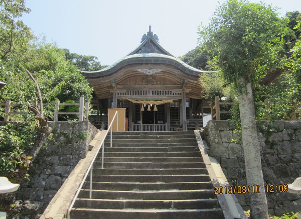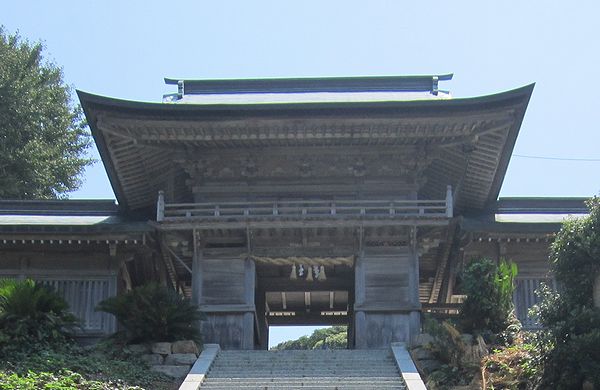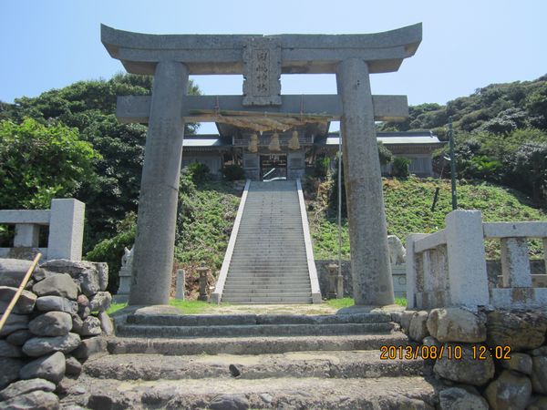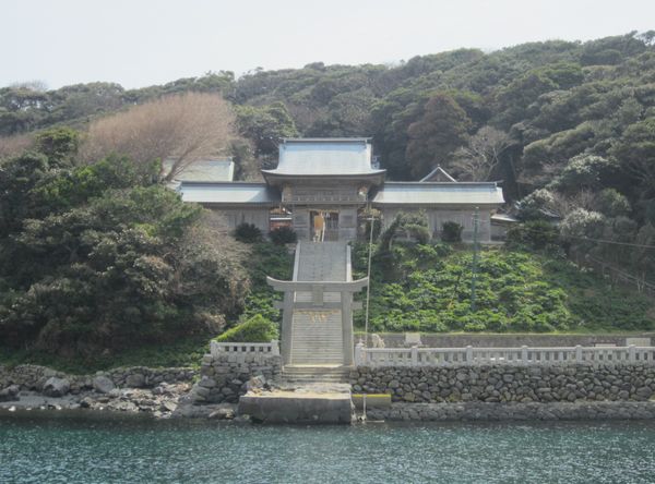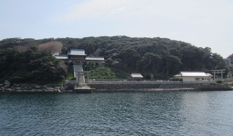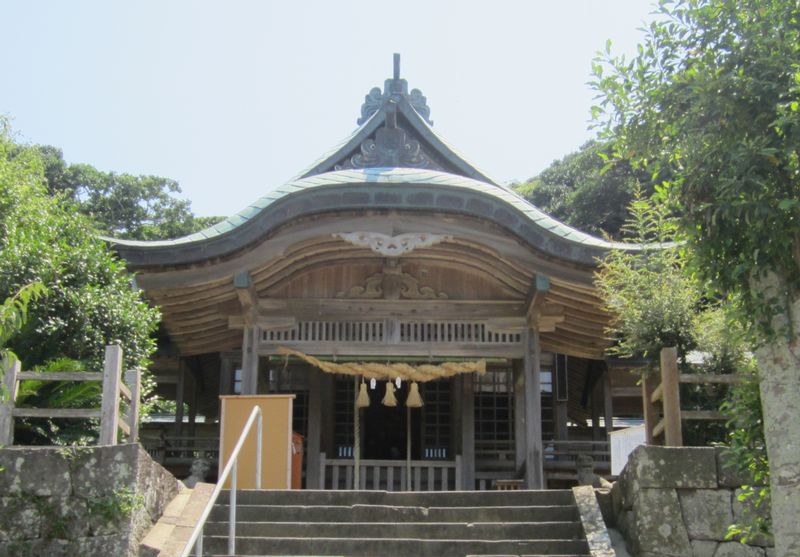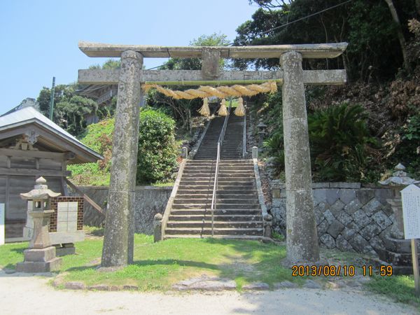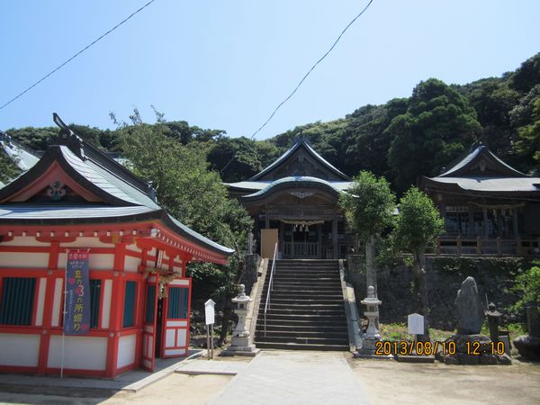 佐賀方面、車での神社めぐり4社めは田島神社です。イカで有名な唐津市呼子の呼子大橋を渡った加部島に鎮座している古い神社です。海からそのまま参道となり、急な階段を登った小高い丘の楼門の先に境内があり、さらにその先の階段を登ったところに社殿があります。拝殿の奥に本殿があるのですが、屋根が見えるだけで本殿の様子は伺い知れませんでした。拝殿の脇から裏の山に登る道があり登ってみると、太閤祈念石という大きな岩がありました。秀吉が朝鮮出兵に際し戦勝祈願をし、祈願後槍を突き立てたところ、その気力で割れたという伝説があるそうです。社務所は、海岸沿いにありましたが、残念ながら不在で御朱印はいただけませんでした。
