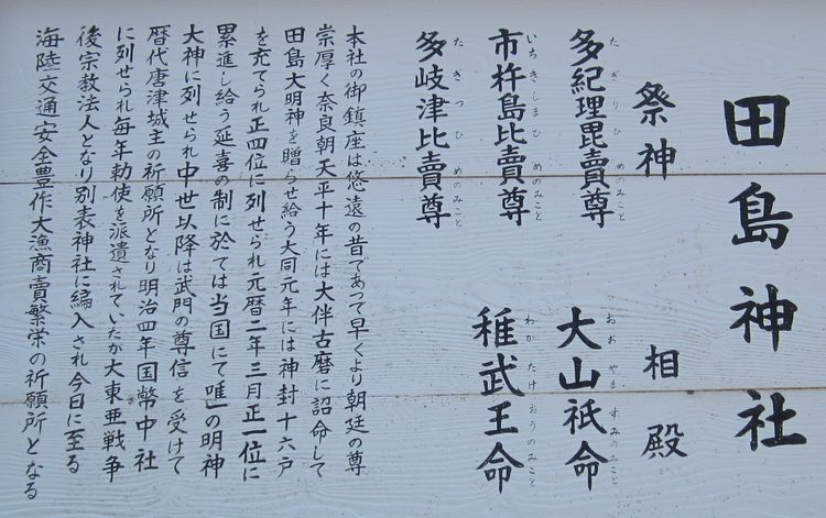 天平3年(731年)に相殿に稚武王を配祀し、天平10年(738年)に聖武天皇より大伴古麻呂に詔命があり「田島大明神」の神号を伝えに来たとされる。この天平3年を創始とする古書もある。