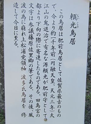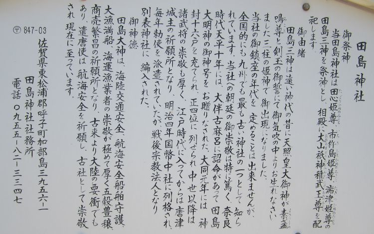 佐賀県唐津市呼子町(旧肥前国松浦郡呼子)の加部島にある神社。地域は魏志倭人伝の中で倭国本土の最初の地として登場する末盧国にあたる。大陸への最も安全な渡海ルートの要所であり、上代以来中央政府の重用を受けてきた。古代においては「田島坐神社(たじまにゐますかみのやしろ)」として記録されている。肥前国唯一の名神大社で、肥前国一之宮と見られた時代もあった。明治時代の改新による旧社格は国幣中社。現在は神社本庁の別表神社。社紋は「桜紋」。大きく分けて4種類の桜紋が境内にあるが、現在は向桜紋が御朱印に使われている。山上憶良が歌に詠んだ松浦佐用姫ゆかりの神社。宗像大社の元宮(ルーツ)ともいわれる。