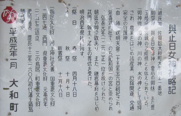 欽明天皇25年(564)年に創祀され、『延喜式神名帳』に記載されています。国衙(こくが:律令制度の頃の役所)との結びつきが強く、二条天皇応保の頃(1161年頃)には「肥前一宮」とされ、弘長元年(1261年)に正一位を授けられました。16世紀與止日女神社一帯は、肥前国において勢力を伸ばそうとしていた戦国大名である龍造寺隆信の軍と、山内(さんない)地方を支配していた神代勝利軍の対立の舞台となり、永禄4年(1561年)には「川上峡合戦」が起こりました。この戦は龍造寺軍が勝利し山内地方に勢力を広げました。当神社は、名勝「川上峡」に位置し、水、川、海の守護神として崇拝されています。また、蛇の妖怪(カナワ)から、ナマズが人々を守ってくださったとの言い伝えにより、当地ではナマズを神の使いとしてあがめ、食用としません。現在の社殿は文化13年(1816年)に、当時当地を治めていた鍋島家により再建されたものです。明治4年(1871年)、近代社格制度により、県社に列せられました。平成25年(2013年)、社殿及び境内が「佐賀市景観重要建造物」に指定されました。