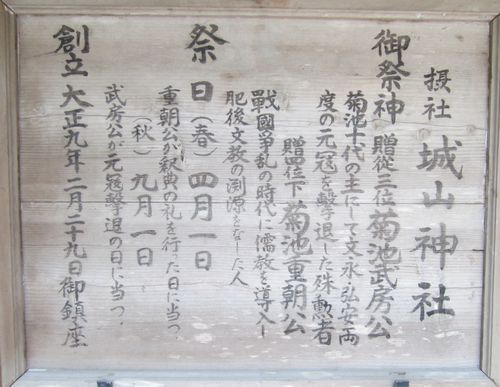 慶応4年(1868年)に熊本藩から明治新政府の参与に出仕した長岡護美が、菊池氏と加藤清正のために神社を創建する案を建議した。同年7月18日、太政官政府はこの建言を採択し、熊本藩に両者の祭祀を執行するよう命じた。そこで熊本藩は、清正のために熊本城内に錦山神社を建て(現加藤神社)、菊池氏のために菊池城址に菊池神社を建てた。菊池神社の鎮座祭は明治3年(1870年)4月28日に行われ、この時に主祭神を菊池武時とし、武重と武光を配祀神とした。