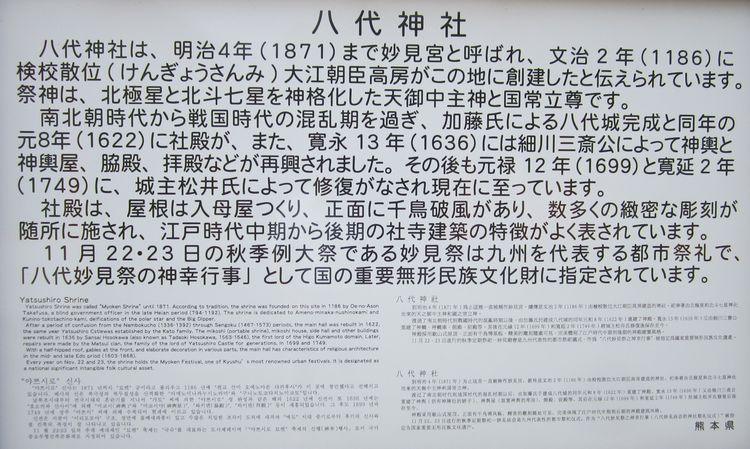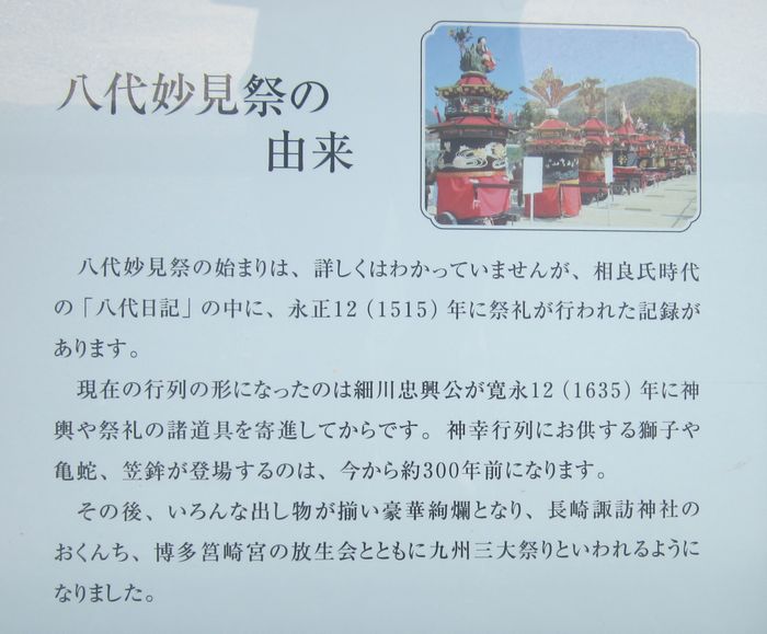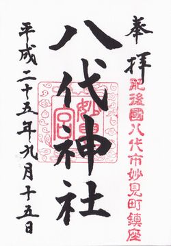 明治4年、神仏分離令により社名を「妙見宮」から「八代神社」に改称。地元では、現在でも「妙見宮」「妙見さん」という名称で呼ばれています。