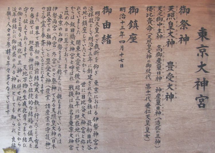 江戸時代、伊勢神宮への参拝は人々の生涯かけての願いでした。明治の新国家が誕生すると、明治天皇のご裁断を仰ぎ、東京における伊勢神宮の遥拝殿として明治13年に創建された当社は、最初日比谷の地に鎮座していたことから、世に「日比谷大神宮」と称されていました。関東大震災後の昭和3年に現在地に移ってからは「飯田橋大神宮」と呼ばれ、戦後は社名を「東京大神宮」と改め今日に至っております。