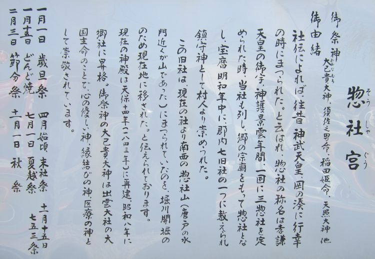 その昔、神武天皇が岡の湊(現在の芦屋のあたり)に行幸(天皇が外出すること)された時に祀られた。と伝えられています。惣社の称名は、孝謙天皇の御代(神護景雲年間)、一つの国に三社の「惣社」を定められた時、当社も中間郷の惣社としてその名を列し、時代が下り宝暦・明和年中(1751~1771)には、郡内七旧社の一つとして数えられ、氏子の人たちの崇敬を集めてきました。