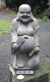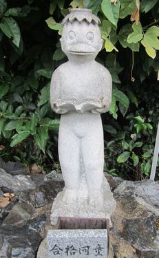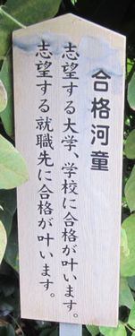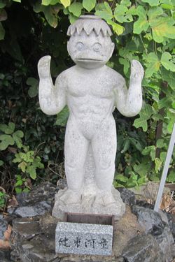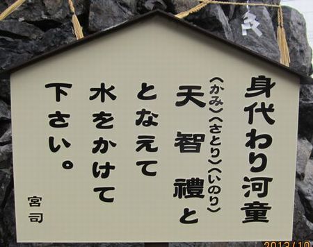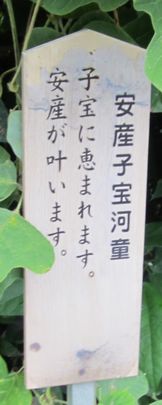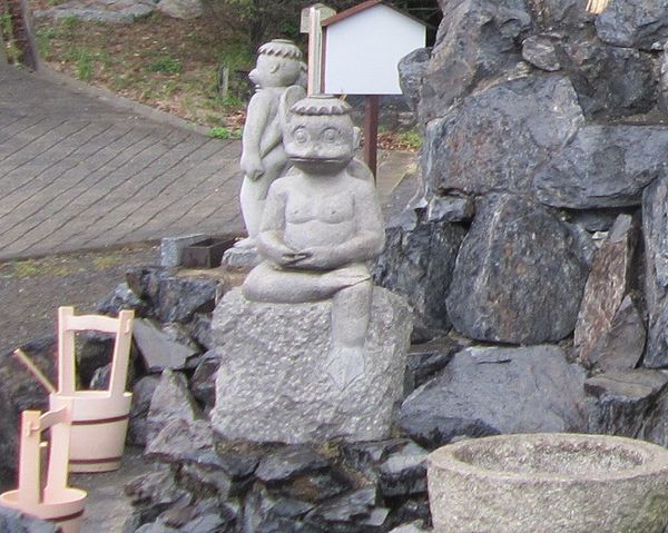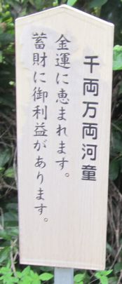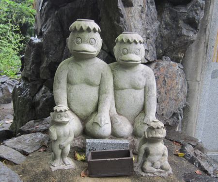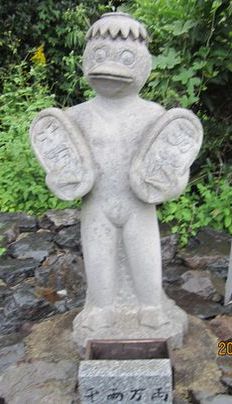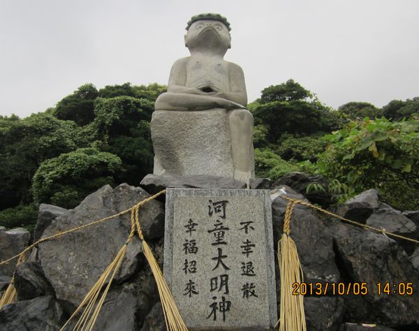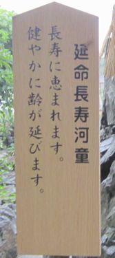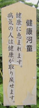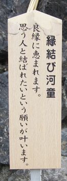 河童については、各地に「河童信仰」、「河童伝説」は数多く、かつ根強くあるように、世代を超えた親しみ深さ、分別とユーモラスさを持ち合わせています。どの地域の河童伝説をみても、概して悪戯好きで、ひょうきんで、ユーモラスなものとなっています。 しかし、悪戯が過ぎて人の怒りを買うことはあっても、決して恨みに迄は発展しておりません。これは、人間にとって許容範囲内のもので「怒っても恨んではいけないよ」ということを暗に教えてくれているのです。 また、河童は「水に引っ張り込む」という得意の力を持っています。この招福河童は、その特性を福として生かすものとして入魂されます。それにより、この招福河童は「よくないもの=不幸」を水中に引っ張り込んで洗って福に変えてくれます。そのお陰をもって「不幸退散」「幸福招来」がかなうというものです。 この招福河童を以って、人々の幸福に寄与しがたいと考えます。 なお、この石像には種々の河童巡りができるようになっています。