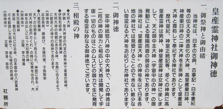 当神社は、日本の古典・古事記・日本書紀等の伝える天地造化の大神、高皇産巣日神、神産巣日神の二神大神を主祭神として皇産霊大神と尊称して奉祀する神社であります。