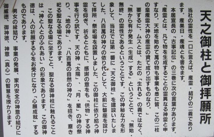 宮中神祇官八神の中の大神で、この神徳は二柱の神の御力と相応じて天地は開発して宇宙一切のものはこのムスビの御力で生に発育する奇霊な妙なる御神徳でございます。