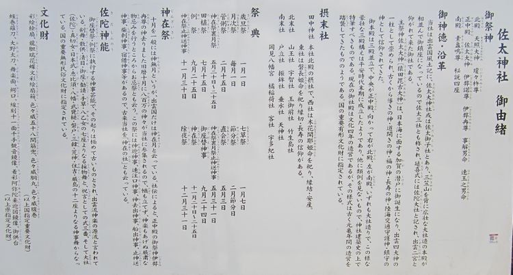様々な歴史的困難にもかかわらず、本殿三社をはじめ、国・県の指定文化財も多数有し、古伝の祭祀を守り受け伝えている点において神道学、民俗学等の面からも注目を置かれているところであります。