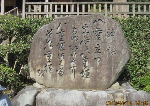出雲方面神社巡り、3社めは須我神社です。八岐大蛇(ヤマタノオロチ)を退治した素盞嗚尊(スサノウノミコト)と稲田姫命(イナタヒメノミコト)夫妻がお宮を建てたところとの伝説があります。この地を訪れた素盞嗚尊が、美しい雲が立ち登るのを見て、「八雲立つ 出雲八重垣 つまごみに 八重垣つくる その八重垣を」と歌われたそうです。この歌が日本で一番古い歌であり、歌中の「出雲」が国名の起源だそうです。