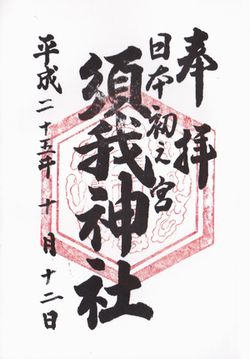簸の川上に於いて八岐遠呂智(やまたのおろち)を退治した須佐之男命(すさのおのみこと)は、稲田姫と共にこの須賀の地に至り「吾が御心清々し」とおっしやつて宮造りをなさった。そのとき美しい雲の立ち昇るのを見て、「八雲立つ 出雲八重垣 つまごみに 八重垣つくる その八重垣を」と歌い、日本で始めての宮殿を作り、鎮まりました。これが古事記・日本書紀に記載されている「須賀宮(すがのみや)」であり、日本初之宮(にほんはつのみや)であります。 三十一文字の歌も日本で一番古い歌であり、この地が「和歌発祥の社」と呼ばれる由縁でもあります。また、この歌の中の「出雲」が出雲の国名の起元であり、「八雲立つ」は「出雲」の枕詞であります。