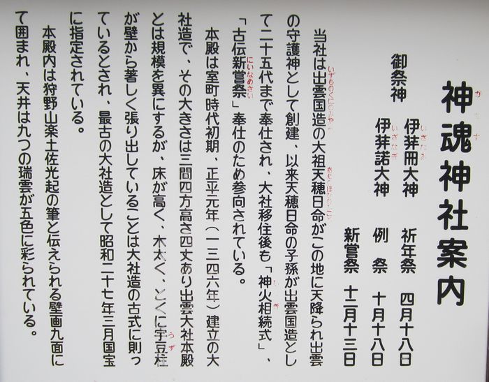 出雲方面神社巡り、5社めは意宇六社のひとつである神魂神社です。大社造りの本殿は大社造りとして日本最古であり、国宝に指定されています。名前からしてチョット普通ではないような気がしていましたが、実際に参拝し社殿を見ると、その拝殿から本殿に掛けての姿は見とれてしまうほど素晴らしく、境内には何ともいえない荘厳な空気が流れていました。