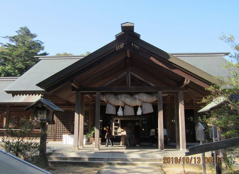 最後に「北陸の能登半島の珠洲の岬に余った土地があった。」と見つけて、鋭い鉏で魚のエラを一刀両断にたつように切り取り、三本綯いの太い綱を結び「国来い、国来い。」と掛け声をかけながら、ゆっくりゆっくりと引き寄せて縫い合わせて行かれました。そうしてできた土地は、美保関です。綱は弓ヶ浜で、杭は伯耆国にある大山です。